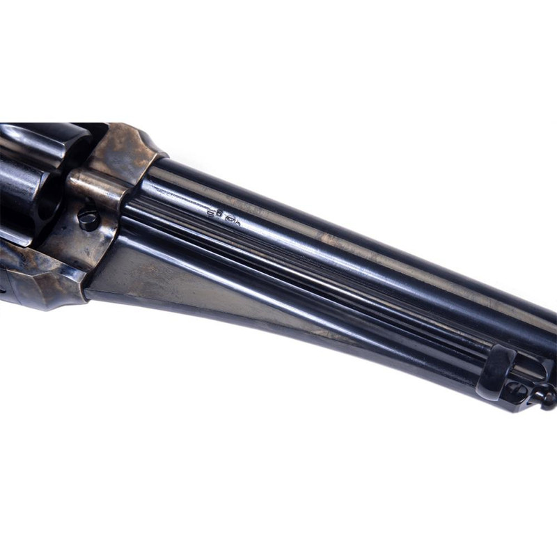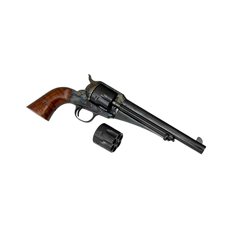 The Taylor & Co 1875 Outlaw is a .45 Colt revolver with a 7.5" barrel and 6-round capacity, featuring a faithful reproduction of the 1875 Remington single-action design. It includes a forged case-hardened steel frame, blued finish, spring-retained cylinder, and walnut grips with fixed sights. This reproduction captures the sturdy quality of the original Remington revolvers used by Old West lawmen and civilians alike.