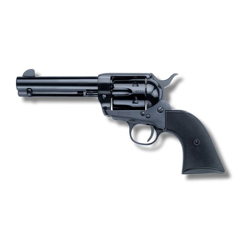 Single-action revolver chambered in .45 Colt with a 4.75" blued barrel and 6-round capacity. Features a steel blued frame with blued steel parts and two-piece checkered black plastic Navy-size grip. Classic 1873 design suitable for modern cartridge ammunition.