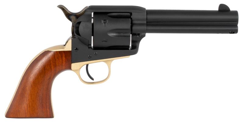 Single-action revolver chambered in .357 Magnum/.38 Special with a 4.75" blued barrel and 6-round capacity. Features a matte blued forged steel frame, case hardened hammer, matte brass backstrap and triggerguard, and walnut Navy-size grip with fixed blade front and notched rear sights. Weighs 2.45 lbs with an overall length of 10.35".