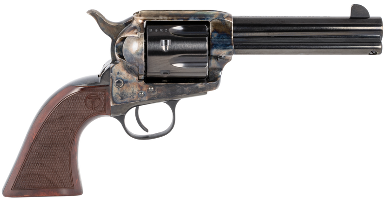 Single-action revolver chambered in .45 Colt with a 4.75" blued barrel and 6-round capacity. Features a case-hardened steel frame, blued cylinder and trigger guard, checkered walnut grips, and fixed blade front/notched rear sights. Weighs 2.45 lbs with an overall length of 10.35".