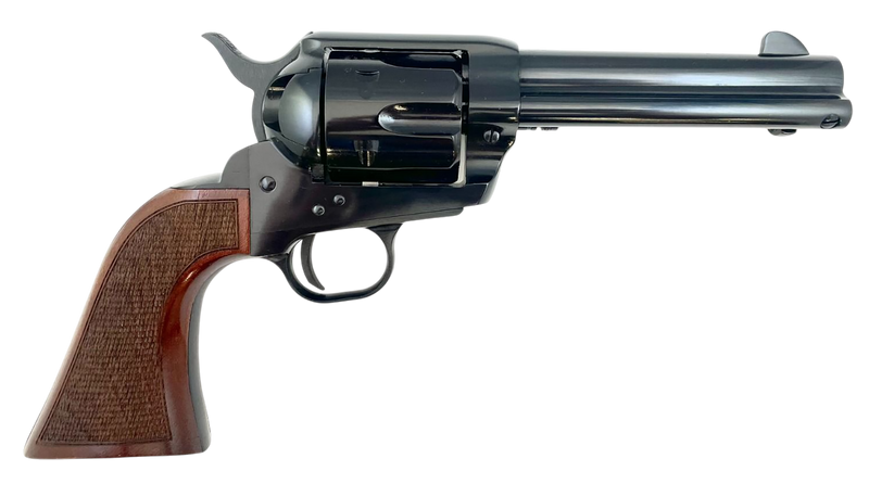 Single-action revolver chambered in 9mm Luger with a 4.75" blued barrel and 6-round capacity. Features a blued steel frame, walnut checkered Army-style grip, fixed blade front and notched rear sights, and exposed hammer. Overall length 10.35", weight 2.45 lbs.