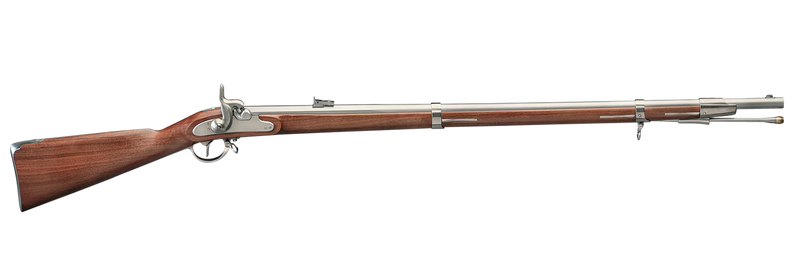 54 caliber percussion muzzleloader with a 37" round white steel barrel and fixed walnut stock. Features blade front and flip-style rear sights, weighs 9 lbs, with a 1:78.75" twist rate designed for traditional blackpowder shooting. This single-shot musket cap percussion rifle is built on the Pedersoli platform and represents a faithful reproduction of 19th-century infantry firearms.