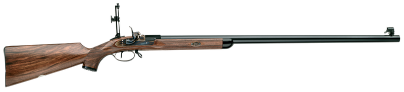 The Taylors and Company Gibbs Pedersoli is a 45 caliber percussion single-shot muzzleloader with a 32.31" blued steel barrel and color case hardened steel receiver. It features dovetail adjustable globe and tang rear sights, a fixed checkered walnut stock, and weighs 11.68 lbs with an overall length of 52.38".