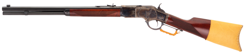 The Taylors and Company 1873 Comanchero is a lever-action rifle chambered in 45 Colt (LC) with an 18" octagon blued barrel and 10+1 capacity. It features a color case hardened steel receiver, walnut straight stock, and adjustable rear sights, with an overall length of 37" and weight of 7.70 lbs.