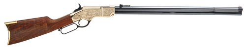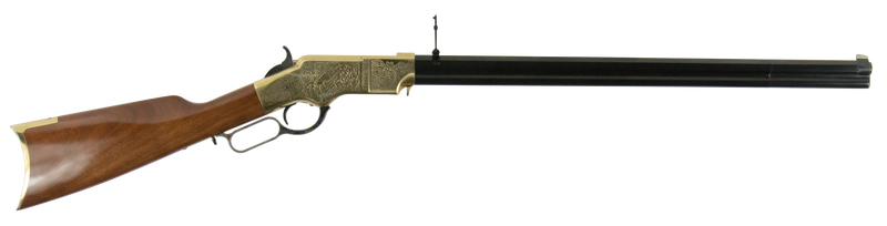 Taylors & Company 1860 Brass Engraved lever-action rifle chambered in 44-40 Win with a 24.25" blued octagon barrel and 13+1 capacity. Features a brass receiver and engraved detailing with walnut stock and blade front/ladder rear sights. Weighs 9 lbs with an overall length of 43.30".