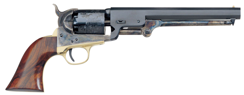 Taylors & Company 1851 Navy Uberti in 36 caliber features single-action operation with percussion ignition and a 7.50" octagon barrel. The revolver includes a case-hardened frame, blued barrel and engraved cylinder, walnut navy-style grip, and post front/notch rear sights. Weighs 2.60 lbs with an overall length of 13 inches.
