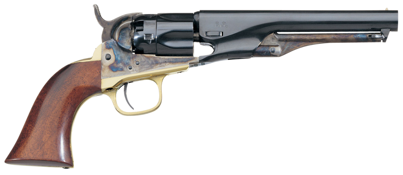The Taylors & Company 1862 Pocket Police is a .36 caliber percussion revolver with a 5.50" blued round barrel and 5-shot capacity. Features a color case hardened steel frame, blued cylinder, walnut grip, and post front sight with single action operation. Weighs 1.50 lbs with an overall length of 9.50".