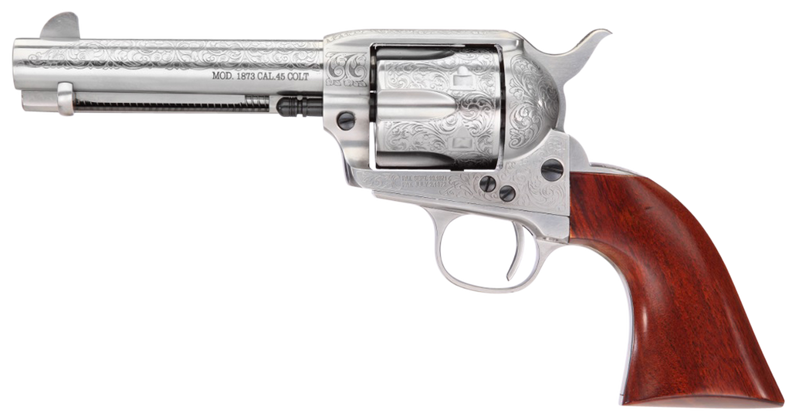 Single-action revolver chambered in .45 Colt with a 4.75" barrel and 6-round capacity. Features a white heat-treated steel frame with laser-engraved floral pattern and hand-chased details, walnut grips, and fixed front blade with notched rear sights. Weighs 2.45 lbs with an overall length of 10.35".