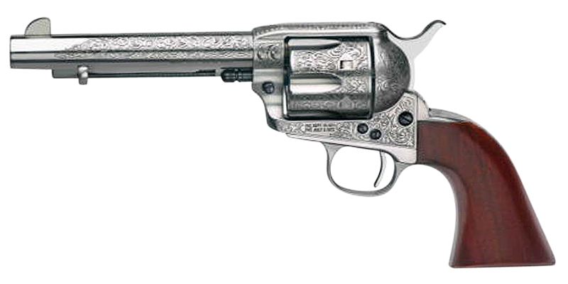 Single-action revolver chambered in 45 Colt with a 5.5" barrel and 6-round capacity. Features a white heat-treated steel frame with laser-engraved floral pattern, fixed front sight blade with rear notch sight, and Navy-size walnut grips. Overall length is 11.1" and weighs 40 oz.