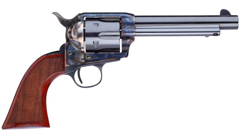 Single-action revolver chambered in 357 Mag with a 5.50" blued barrel and 6-round capacity. Features a color case hardened steel frame, blued cylinder, walnut Army-size grips, and fixed blade front/notched rear sights. Weighs 40 oz with an overall length of 11.10".