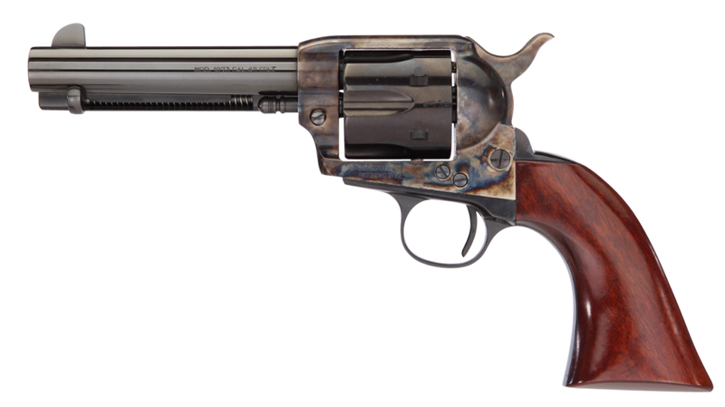 Single-action revolver chambered in 357 Magnum with a 4.75" blued barrel and 6-round capacity. Features a color case hardened steel frame, walnut army-size grips, fixed front and notched rear sights, and Taylor Tuned action. Overall length is 10.3" and weighs 39.2 oz.