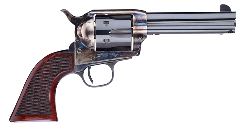 Single-action revolver chambered in .357 Magnum with a 4.75" blued barrel and color case hardened steel frame. Features a 6-round capacity, checkered walnut Navy-style grips, blade front and notched rear sights, and weighs 2.45 lbs. Purpose-built for cowboy action shooting with Taylor-tuned mechanics.