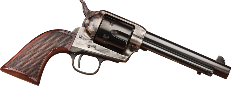 Single-action revolver chambered in .357 Magnum with a 5.50" blued barrel and 6-round capacity. Features a color case hardened steel frame, checkered walnut Navy-style grips, and blade front/notched rear sights. Designed for cowboy shooting with an overall length of 11.10" and weight of 2.50 lbs.