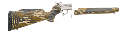 Break-action rifle frame with stainless steel receiver and Mossy Oak Bottomland FlexTech stock and forend. Features adjustable trigger for overtravel, hammer block safety, and drilled/tapped for scope mounting. Single-shot capacity with external hammer firing system.