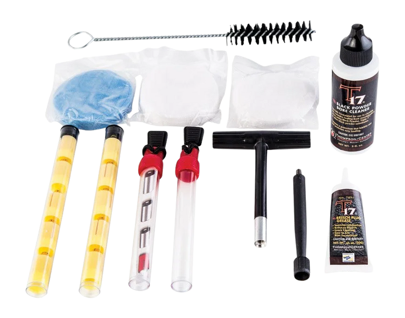 This accessory kit is designed for Thompson Center T17 ProHunter firearms and includes cleaning and maintenance components. The kit provides essential tools for firearm care and upkeep. Includes multiple accessories to support proper gun maintenance.