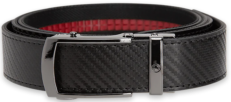 Ratchet-style EDC gun belt designed for concealed carry with a stiff carbon black leather strap engineered to support the weight of a handgun. Features a 1.375" width and buckle closure, recommended for business professionals and those in law enforcement or personal defense. Durable leather construction provides reliable performance for everyday carry applications.