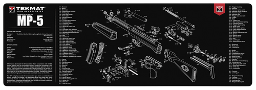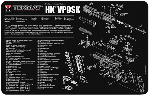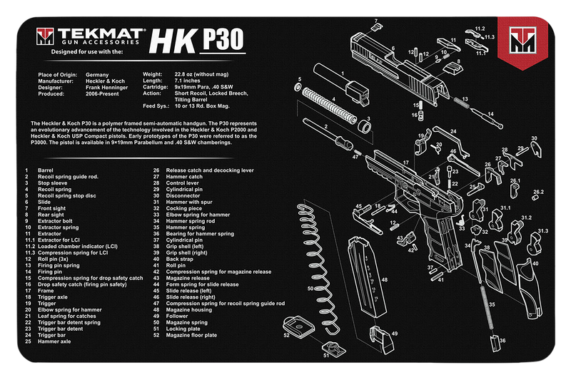 An 11" x 17" rubber cleaning mat with 1/8" padding designed for HK P30 handguns. Features printed parts diagram, oil and water-resistant surface, and protective design to guard against scratches and chipping during disassembly and maintenance.