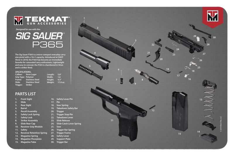 TekMat is an 11" x 17" printed cleaning and maintenance mat designed for the Sig Sauer P365 handgun, featuring 1/8" padding and an ultra-soft, oil and water-resistant rubber surface. The mat includes detailed parts diagrams and illustrations and provides ample space for a fully disassembled handgun plus tools and accessories. This mat offers protection against chipping and scratching while handling firearms, and includes a small microfiber TekTowel.