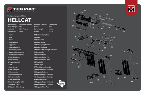 TekMat cleaning mat designed specifically for S&W M&P pistols with printed parts diagram and 1/8" padding for protection against scratches and impact damage. The 11"x17" size accommodates fully disassembled handguns with room for tools and accessories. Features an oil and water-resistant surface and includes a small microfiber TekTowel.