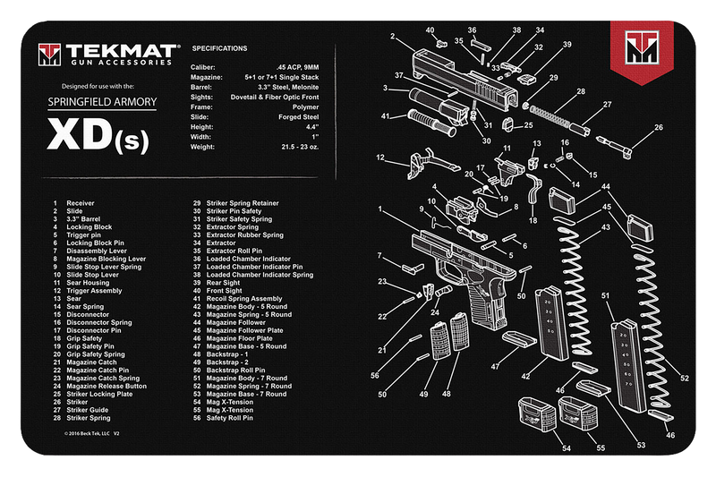 This 11" x 17" rubber cleaning mat features a printed parts diagram for the Springfield Armory XDs and includes 1/8" padding for protection against scratches and impacts. The oil and water-resistant surface accommodates a fully disassembled handgun with space for tools and accessories.