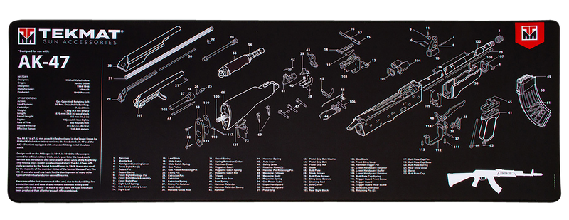 A 12"x36" rubber cleaning and maintenance mat designed for field-stripping and working on AK-47 rifles. The mat features printed parts diagrams, 1/8" padding for protection against scratches and drops, and an oil and water-resistant surface. Includes a small microfiber TekTowel and comes packaged in a tube for portability.