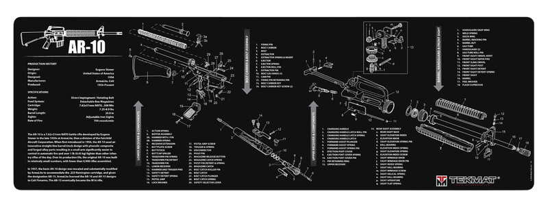This 12" x 36" TekMat is a rubber cleaning mat with 1/8" padding designed for disassembling and maintaining AR-10 rifles. The oil and water-resistant surface protects firearms from scratches and chipping, while printed diagrams provide a quick reference guide. Includes a small microfiber TekTowel and comes packaged in a protective tube.