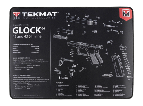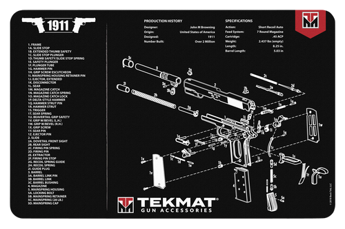 The TekMat Ultra 20 is a premium 15"x20" rubber cleaning mat designed for handgun maintenance and disassembly. It features a printed 1911 parts diagram, extra-thick 0.25" padding, and a stitched edge for durability and protection against chipping and scratching. The mat includes a small microfiber TekTowel and is packaged in a tube for easy storage and transport.