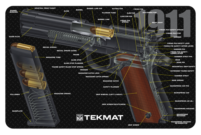 This 11" x 17" rubber cleaning mat features a printed 1911 diagram with 3D cutaway design for detailed firearm disassembly reference. The non-slip rubber surface protects against chipping and scratching during cleaning and maintenance. Ideal for armorers and handgun enthusiasts working on 1911 pistols.