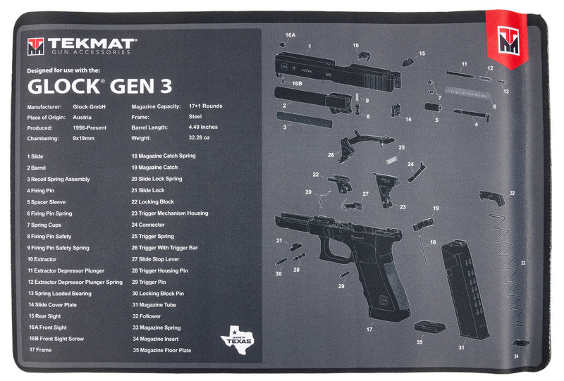 This 11" x 17" TekMat cleaning mat features a thermoplastic rubber surface designed to protect firearms from chipping and scratching during maintenance and assembly. The mat includes a printed Glock Gen 3 parts diagram for reference, making it ideal for field or bench cleaning operations.