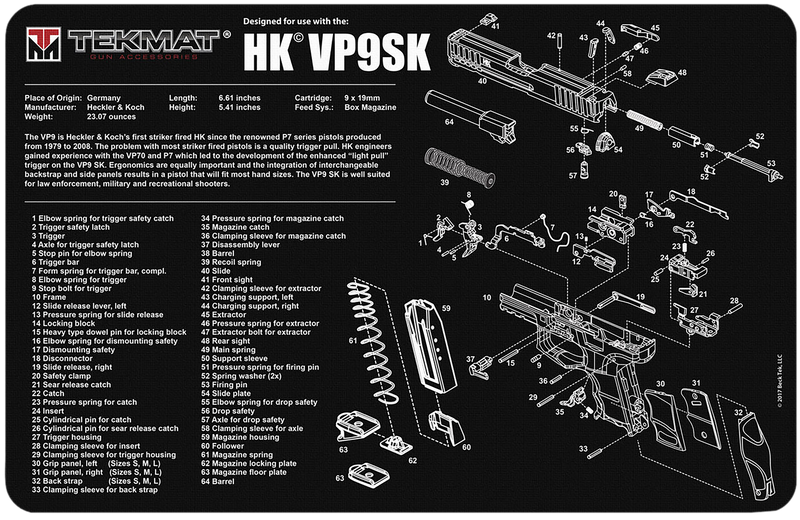 This 11" x 17" rubber cleaning mat features a detailed HK VP9SK parts diagram printed on the surface for field stripping and maintenance. The mat protects firearms and work surfaces against chipping and scratching during cleaning and assembly. Designed for handgun maintenance and armorer work.