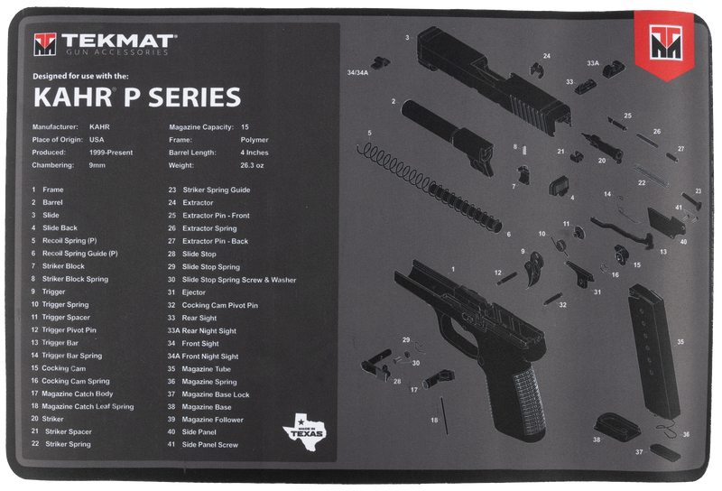 This TekMat cleaning mat is a black rubber mat measuring 11" x 17" designed specifically for KAHR handguns, featuring a printed diagram for field stripping and maintenance. The rubber material protects firearms against chipping and scratching during cleaning and disassembly. Ideal for use as a dedicated workspace during handgun cleaning and maintenance.