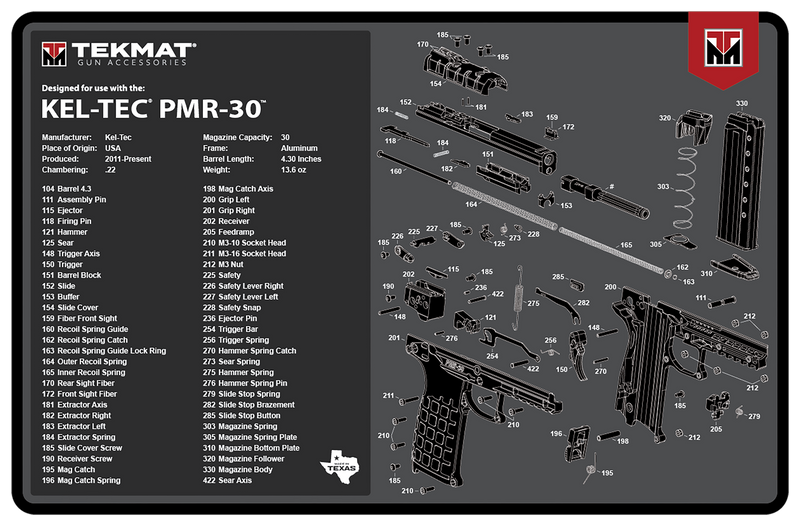 TekMat cleaning mat sized for field stripping and maintenance of the Kel-Tec PMR-30 handgun. The 11" x 17" rubber mat features a printed parts diagram for the PMR-30 and protects against chipping and scratching during cleaning and assembly. Gray rubber construction provides durability and a non-slip surface for work bench use.