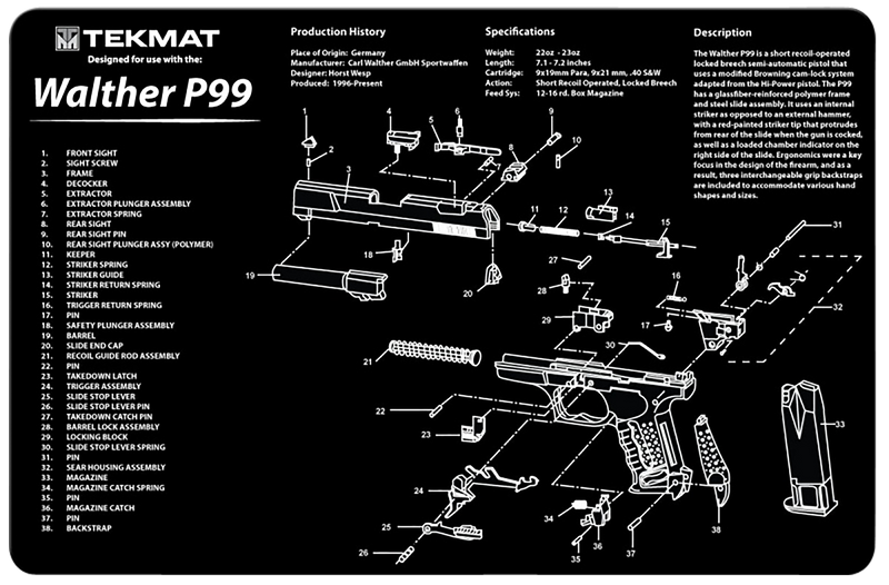 This 11" x 17" rubber cleaning mat features a printed Walther P99 parts diagram for field stripping and maintenance. The mat protects firearms and work surfaces against chipping and scratching during cleaning and assembly operations.