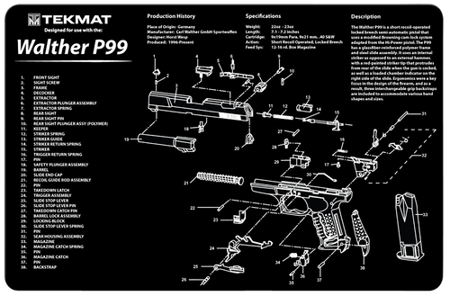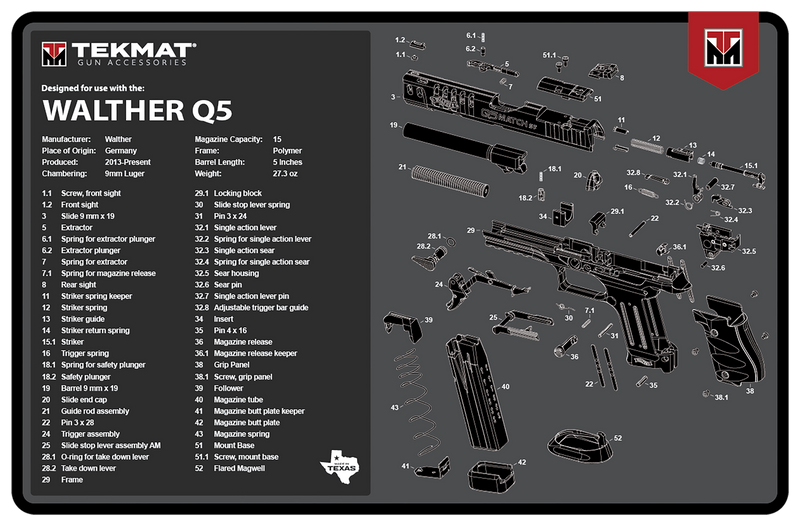 This 11" x 17" TekMat cleaning mat features a black and gray rubber construction designed specifically for the Walther Q5 SF handgun. The mat includes a detailed parts diagram for field stripping and protects firearms against chipping and scratching during maintenance and cleaning operations.