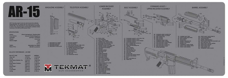 TekMat armorer's bench cleaning mat designed for AR-15 rifle maintenance and parts organization. Features a durable gray rubber construction measuring 12" x 36" with printed AR-15 parts diagram. Protects firearm components against chipping and scratching during cleaning and assembly work.