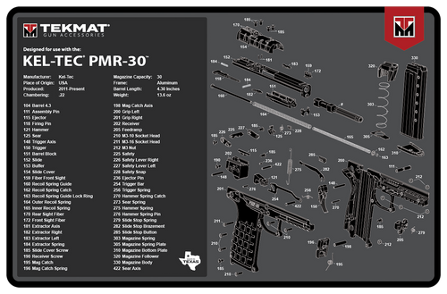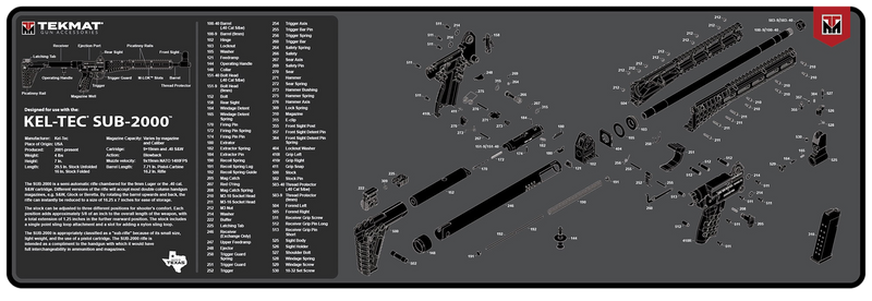 This 12" x 36" rubber cleaning mat features a printed Kel-Tec SUB2000 parts diagram for organized firearm maintenance and assembly. The rubber construction protects firearms against chipping and scratching during cleaning and disassembly. Designed specifically for the Kel-Tec SUB2000 platform.
