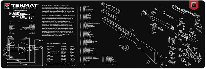 This TekMat armorer's bench mat measures 12" x 36" and features a rubber construction with a printed Ruger Mini-14 parts diagram. The mat protects firearms against chipping and scratching during cleaning and maintenance.
