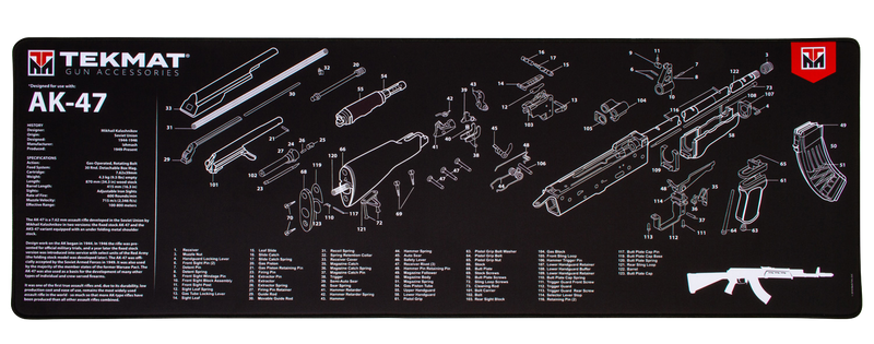 TekMat AK-47 Ultra 44 Cleaning Mat is a 15" x 44" rubber mat featuring an AK-47 parts diagram printed on the surface. The mat protects firearms against chipping and scratching during cleaning and maintenance, and includes a small microfiber TekTowel. Designed for rifle cleaning and field disassembly work.