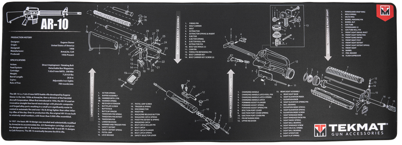This 15"x44" cleaning mat features a thermoplastic rubber surface designed to protect firearms from scratching and chipping during maintenance. The mat includes a printed AR-10 parts diagram and is 1/4" thick for cushioning and durability. It comes in tube packaging for easy storage and portability.