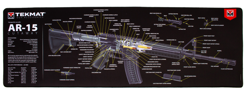 Premium 15" x 44" rubber cleaning mat featuring a detailed 3D AR-15 cutaway illustration for armorer's bench work. Includes a small microfiber TekTowel and comes packaged in a protective tube. Protects firearms against chipping and scratching during maintenance and assembly.
