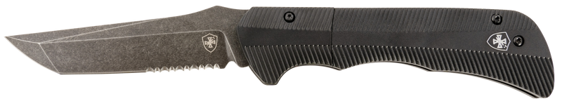The Templar Knife Auto Assist features a 3.50" D2 steel blade with tanto point and partial serration, housed in a 4.25" aged aluminum handle for a total length of 7.75". This push-button auto-assist folding knife weighs 3.70 oz and is designed for everyday carry and general utility tasks. The black oxide stonewashed blade finish provides corrosion resistance and a tactical aesthetic.
