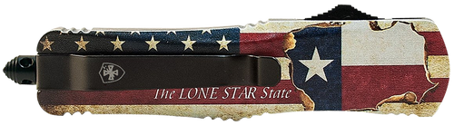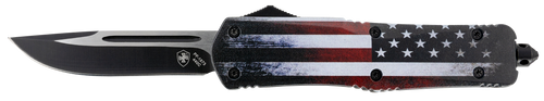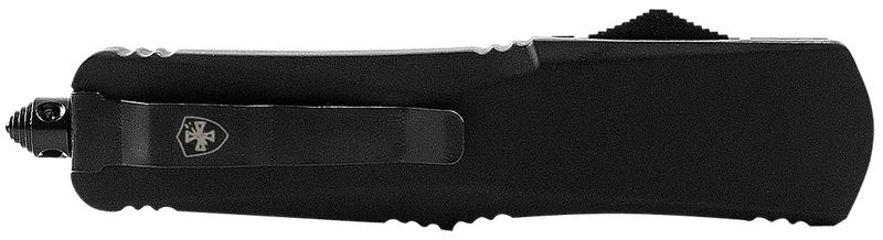 This is an out-the-front (OTF) automatic knife featuring a 3.50" drop point blade made from 440C stainless steel with a black oxide stonewashed finish. The knife has a 5.25" black aluminum and rubber handle with a glass breaker and comes with a ballistic nylon sheath for carry.
