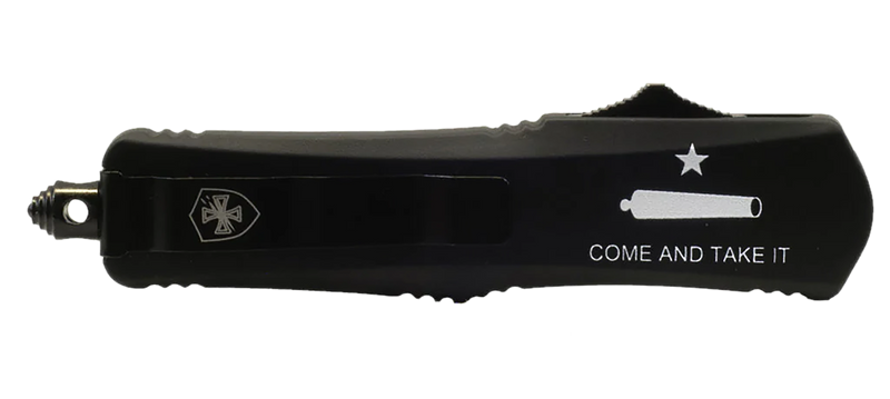 This is an out-of-the-front (OTF) slider knife featuring a 2.69" black oxide 440C stainless steel tanto blade with partial serration. The knife has a 4.31" overall closed length with a black aluminum "Come And Take It" handle and includes a glass breaker tool for emergency use.