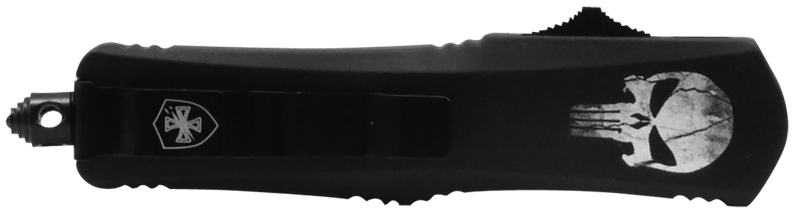 This is an out-of-the-front (OTF) dagger knife featuring a 3.50" blade made from 440C stainless steel with partial serration and black oxide stonewash finish. The knife has a 5.25" closed length with a black aluminum handle featuring skull design, slider button deployment, and includes a glass breaker utility feature. It comes with a nylon sheath and weighs 8.20 oz.