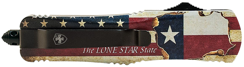 The Templar Knife LTX631 Gen II Texan is a large out-the-front (OTF) folding knife featuring a 3.50" drop point blade with partial serration, crafted from 440C stainless steel with black oxide stonewashed finish. The knife includes a 5.25" Texas flag-themed aluminum handle, glass breaker feature, and opens via slider button mechanism with a nylon sheath included.