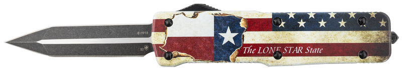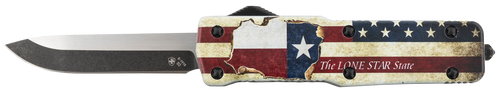 This Templar Knife features a 3.55" D2 steel blade with black oxide stonewashed finish in a dagger profile, paired with a red, white, and blue aluminum zinc alloy handle decorated with "The LONE STAR State" design. The knife opens via slider button mechanism and has an overall length of 8.75" when fully extended. Weighing 8.60 oz, this premium weighted model is designed for users seeking a high-visibility, Texas-themed OTF (out-the-front) knife.