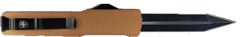 This is a 3.25" OTF (out-the-front) dagger knife with a D2 steel blade featuring black oxide stonewashed and powder coated finish. The 5" bronze anodized aluminum handle provides a lightweight design at 3.5 oz, with an overall length of 8.25" and slider button activation.