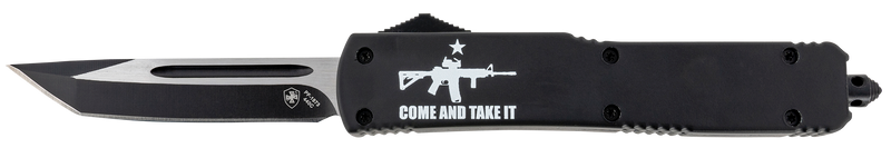 This is an out-the-front (OTF) tactical knife featuring a 3.43" Tanto-style blade made from 440C stainless steel with a black oxide and stonewashed finish. The knife has an overall length of 8.48" when open, a black aluminum handle with "Come And Take It" AR-15 themed graphics, and includes a glass breaker feature. It operates via slider button mechanism and comes with a nylon sheath.