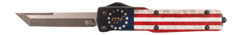 This is a 3.16" OTF (out-the-front) dagger blade knife with a D2 steel blade featuring black oxide stonewashed and powder coat finish. The 4.93" aluminum zinc alloy handle is decorated with a Betsy Ross Flag design and operates via slider button mechanism, with an overall length of 8.09" and weight of 5.90 oz.