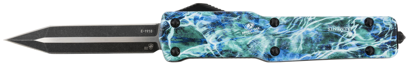 This Templar Knife features a 3.16" D2 steel dagger blade with plain edge and black oxide stonewashed finish, designed for a slim profile at 8.09" overall length. The handle is constructed from Mossy Oak Seafoam aluminum zinc alloy and operates via slider button mechanism. Weighing 5.90 oz, this premium weighted knife is built for reliable performance in demanding conditions.